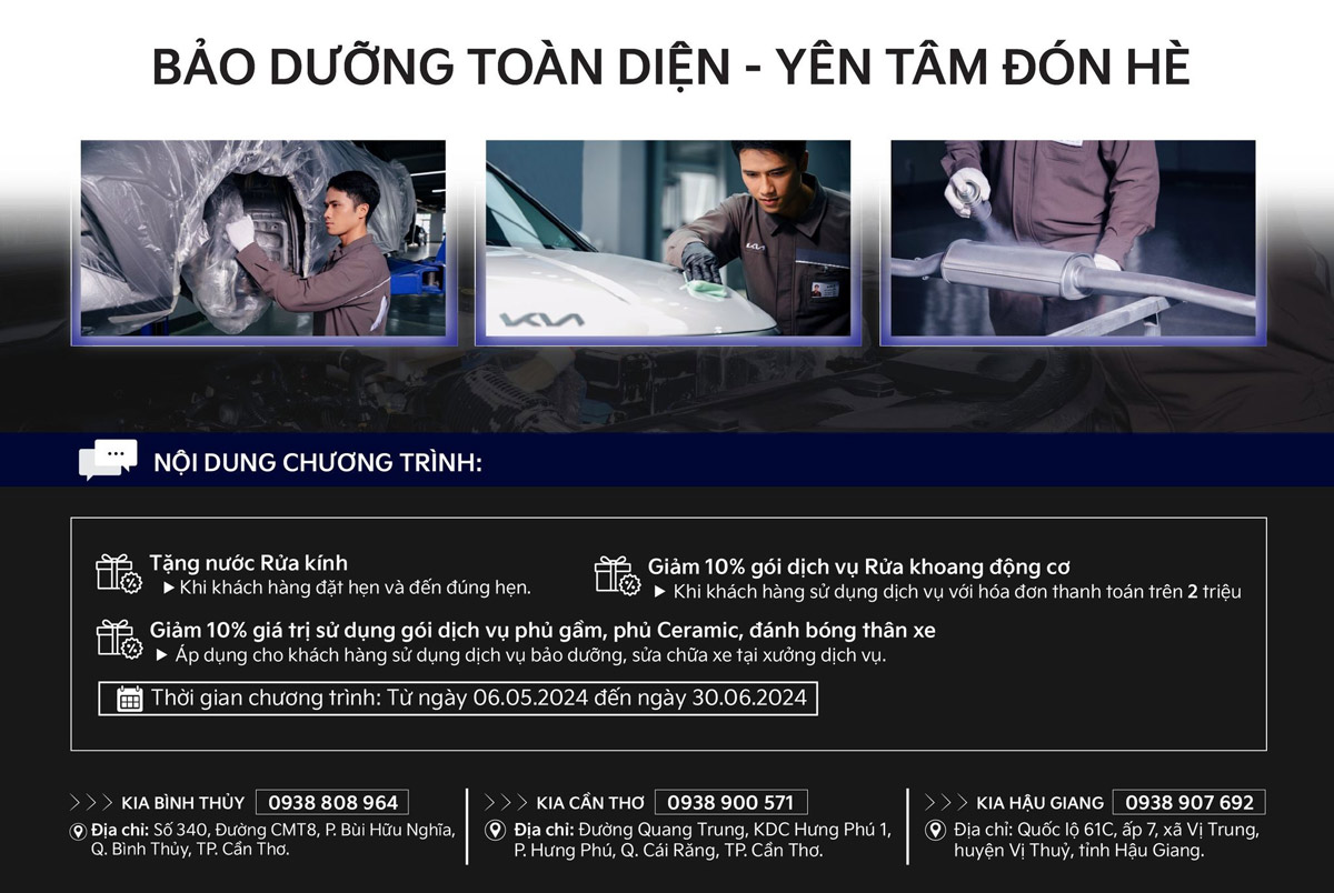 Hiểu được những băn khoăn của khách hàng về chi phí và thời gian khi bảo dưỡng xe trước mùa hè, Xưởng Dịch vụ Kia tại Cần Thơ giới thiệu chương trình ưu đãi dịch vụ hấp dẫn trong tháng 6 này: