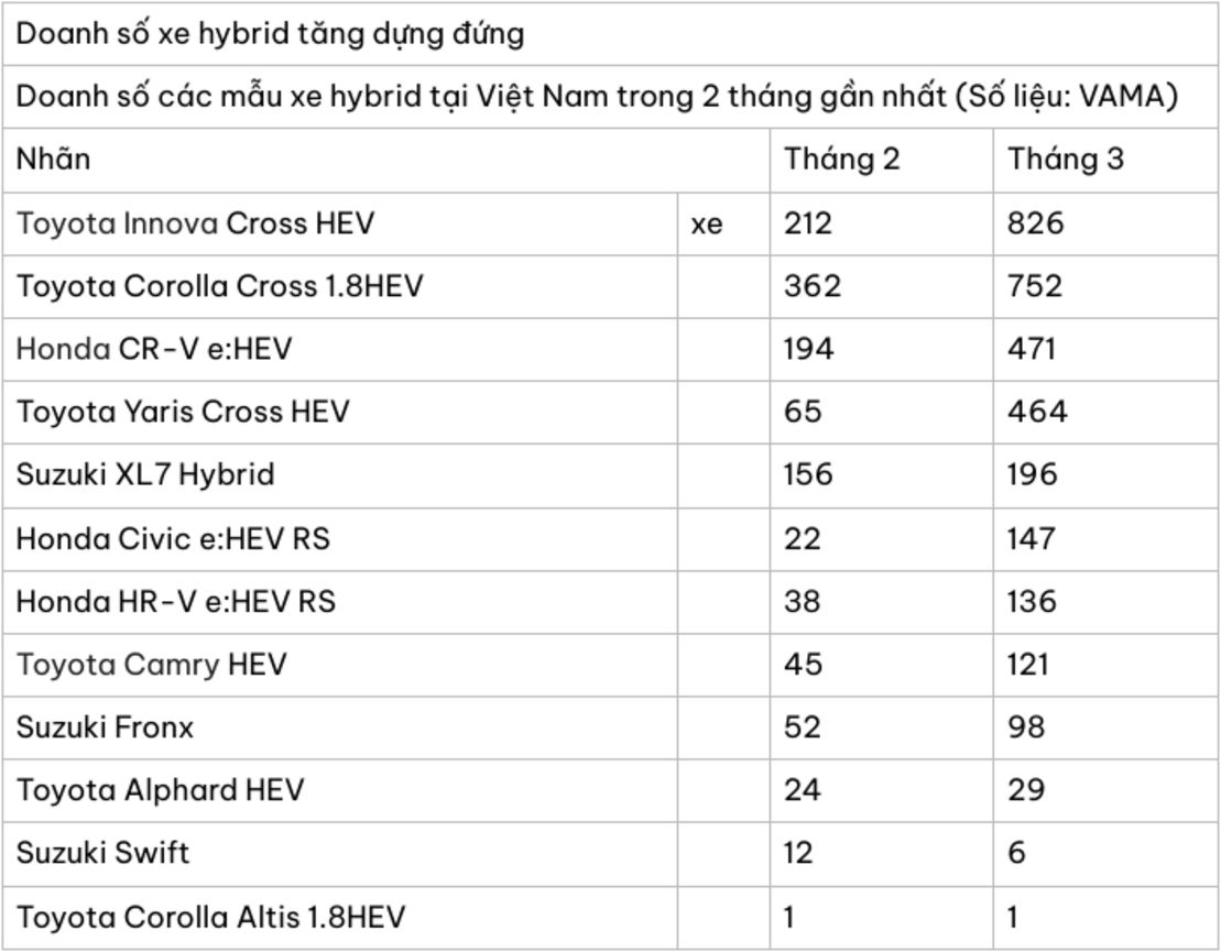 Hai phiên bản hybrid của Toyota Camry cũng đạt doanh số 121 xe trong tháng 3, chiếm gần 80% tổng doanh số của dòng sedan cỡ D này tại thị trường Việt Nam. Xếp sau là Suzuki Fronx với 98 xe, Toyota Alphard HEV với 29 xe và Suzuki Swift với 6 xe. Toyota Corolla Altis 1.8HEV là mẫu xe có doanh số thấp nhất trong báo cáo tháng 3, chỉ với 1 xe được bán ra.