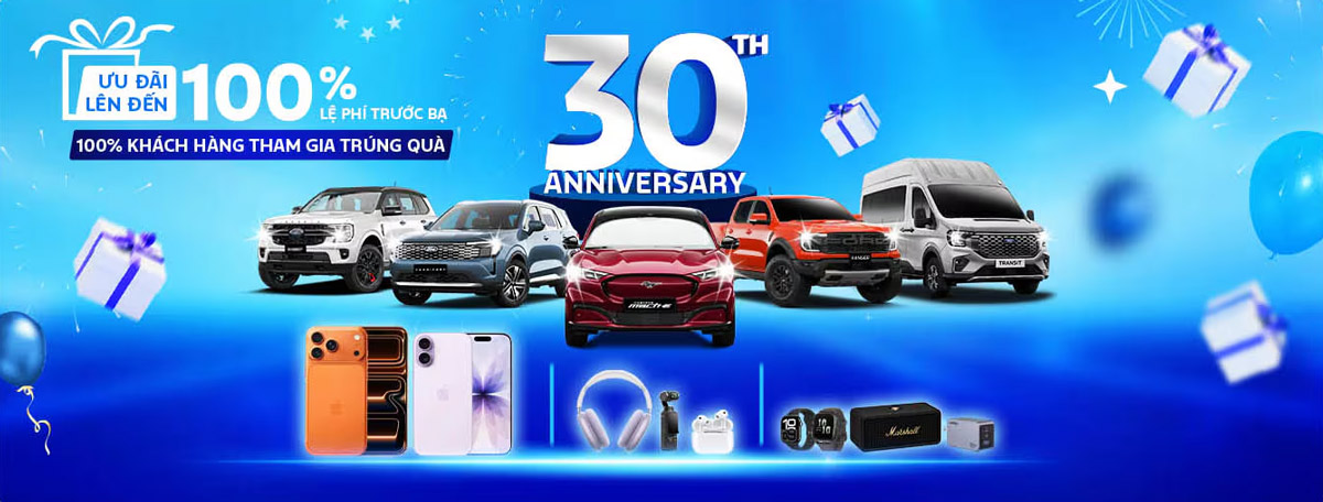 Tháng 10/2025 đánh dấu cột mốc 30 năm Ford đồng hành cùng khách hàng Việt Nam. Để kỷ niệm sự kiện đặc biệt này, Ford Việt Nam cùng hệ thống đại lý trên toàn quốc chính thức khởi động chương trình khuyến mãi “Đại Tiệc Sinh Nhật Mừng Ford 30 Năm” với tổng giá trị giải thưởng lên đến gần 6 tỷ đồng, mang đến cơ hội vàng sở hữu xe Ford và nhiều phần quà công nghệ đẳng cấp.