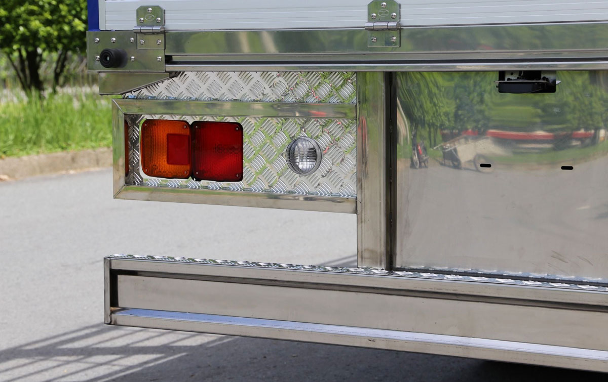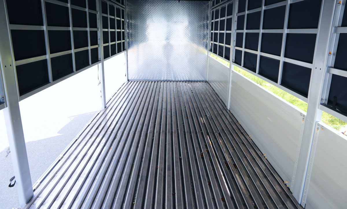 Trong khi phiên bản sàn phẳng phù hợp với hàng hóa đóng pallet hoặc hàng kiện đều, phiên bản sàn sóng này được thiết kế cho các nhu cầu vận tải đặc thù hơn. Cấu trúc dập sóng trên bề mặt Inox 430 tạo ra các rãnh dọc theo chiều dài thùng hàng, mang lại hai lợi ích trực tiếp: tăng ma sát giữa hàng hóa và sàn xe — giảm nguy cơ hàng bị trượt trong quá trình tăng tốc, phanh hoặc qua cua — và cho phép thoát nước, dịch lỏng từ hàng hóa (như nông sản tươi, hải sản) ra ngoài dễ dàng mà không đọng lại trên sàn.
