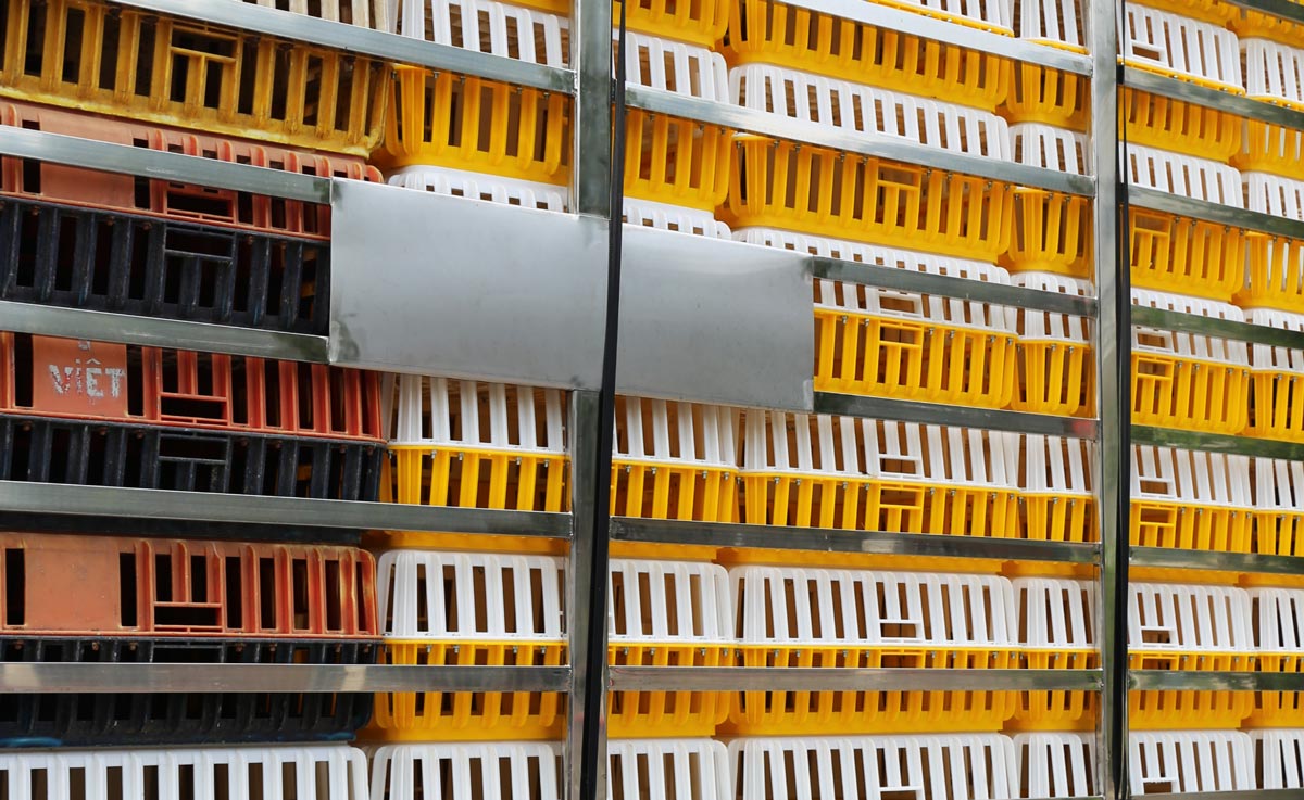 - Sức chứa lên đến 196 lồng gia cầm — mỗi lồng có kích thước chuẩn 735 × 535 × 305 mm, được bố trí khoa học để tối đa hóa số lượng lồng trên mỗi chuyến xe đồng thời đảm bảo thông thoáng cho gia cầm.