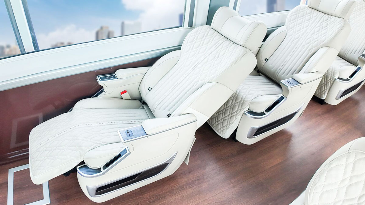 Toàn bộ ghế ngồi được bọc da cao cấp mềm mại với thiết kế nâng đỡ cột sống tốt — điều đặc biệt quan trọng trong những hành trình kéo dài nhiều giờ. Điểm nổi bật là hệ thống điều chỉnh ghế thông minh được đặt ngay trên tay cầm, cho phép hành khách tự điều chỉnh góc ngả theo ý muốn mà không cần nhờ đến ai và không làm phiền người xung quanh — chi tiết nhỏ nhưng thể hiện sự chú trọng đến trải nghiệm người dùng thực tế.