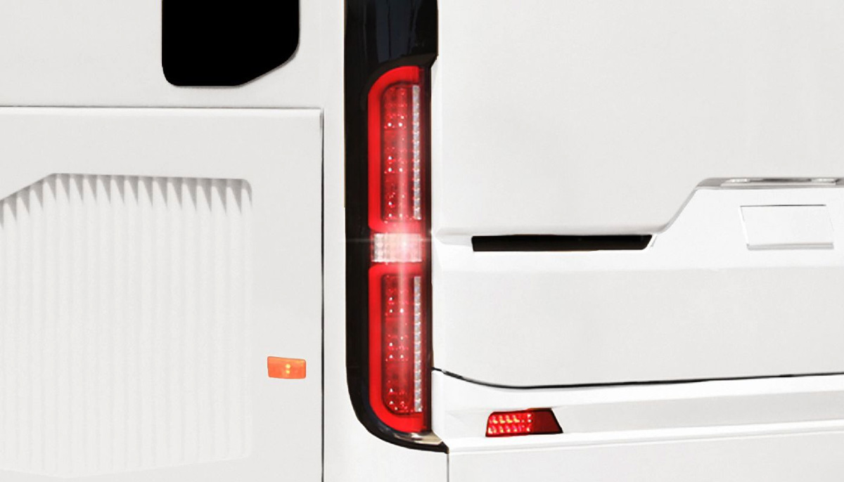 Thân xe dài 12,2 mét với các đường nét khí động học dập nổi tinh tế — không chỉ tạo chiều sâu thị giác mà còn góp phần giảm sức cản gió, cải thiện mức tiêu thụ nhiên liệu trong vận hành đường trường liên tục. Sơn tĩnh điện bền màu, đường viền chrome tinh tế và họa tiết trang trí dọc thân xe giúp tăng tính nhận diện thương hiệu — mỗi chuyến xe lăn bánh cũng là một lần quảng bá hình ảnh doanh nghiệp vận tải.