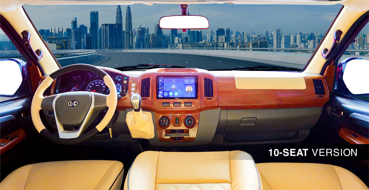Khoang lái: Tài xế được bố trí trong không gian làm việc chuyên nghiệp với ghế da êm ái nâng đỡ cột sống trong những ca lái dài. Màn hình ODO hiển thị tốc độ và các thông số vận hành rõ ràng, trực quan. Vô lăng 3 chấu ốp nhựa giả chrome mang lại cảm giác cầm nắm tự tin, chắc tay. Cần số tích hợp ngay trên bảng điều khiển giữ không gian khoang lái gọn gàng, thoáng đãng — để tài xế tập trung hoàn toàn vào việc đưa hành khách đến nơi an toàn.