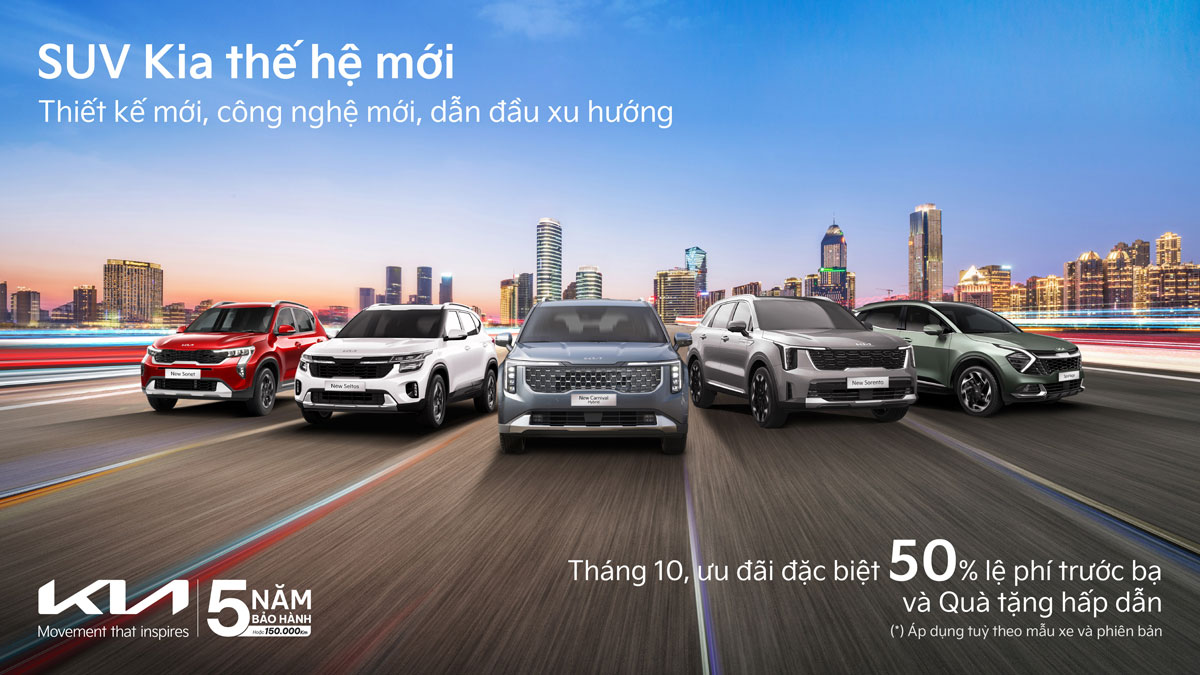 Nhân cột mốc 400.000 xe tại Việt Nam, Kia triển khai hàng loạt hoạt động trong tháng 10: ra mắt mẫu xe mới, bổ sung tiện ích, tùy chọn màu nội thất cao cấp cùng chương trình hỗ trợ lệ phí trước bạ đến 50%. Khách hàng còn được tặng nhiều quà giá trị tại hệ thống showroom trên toàn quốc (tùy dòng xe, phiên bản).