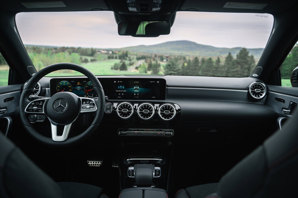 Gói trang bị nội thất Exclusive đặc trưng với hệ thống đèn viền trang trí mười hai màu sắc, tay lái ba chấu thế hệ mới và thiết kế cụm đồng hồ mới với màn hình đa chức năng bao nổi bật trong nội thất thượng hạng của chiếc A-Class.