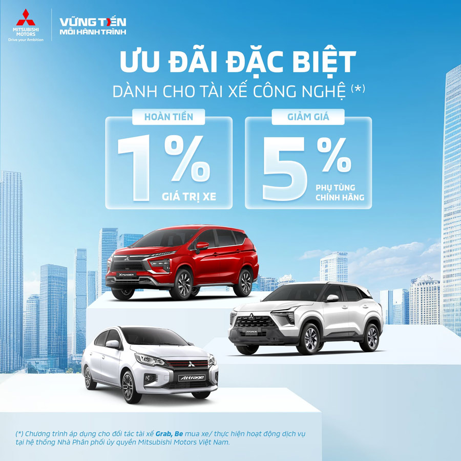 Mitsubishi Motors Việt Nam triển khai chương trình đặc biệt dành riêng cho đối tác tài xế Grab và Be, nhằm tối ưu hóa chi phí đầu tư ban đầu và nâng cao hiệu quả vận hành xe. Với ưu đãi giảm giá trực tiếp cùng các đặc quyền dịch vụ hậu mãi độc quyền, Mitsubishi cam kết đồng hành bền vững cùng các đối tác trên mọi hành trình.