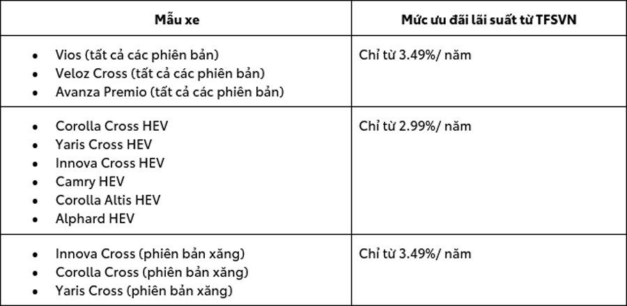 Quý khách hàng quan tâm đến các điều khoản và điều kiện cụ thể của chương trình ưu đãi lãi suất từ TFSVN trong tháng 8.2025 vui lòng liên hệ trực tiếp các Đại lý Toyota trên toàn quốc để nhận được sự tư vấn chi tiết và chính xác nhất. Mọi thông tin cập nhật sẽ được thông báo đầy đủ từ TFSVN.