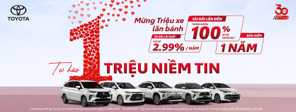 Chào mừng cột mốc ấn tượng một triệu xe Toyota lăn bánh tại Việt Nam, Công ty Ô tô Toyota Việt Nam (TMV) cùng mạng lưới đại lý trên toàn quốc chính thức khởi động hàng loạt ưu đãi đặc biệt trong tháng 8/2025. Chương trình khuyến mại đa dạng này nhằm tri ân khách hàng và mang đến cơ hội sở hữu những mẫu xe đẳng cấp, từ xe mới đến các lựa chọn hybrid tiên tiến cùng gói hỗ trợ tài chính hấp dẫn.
